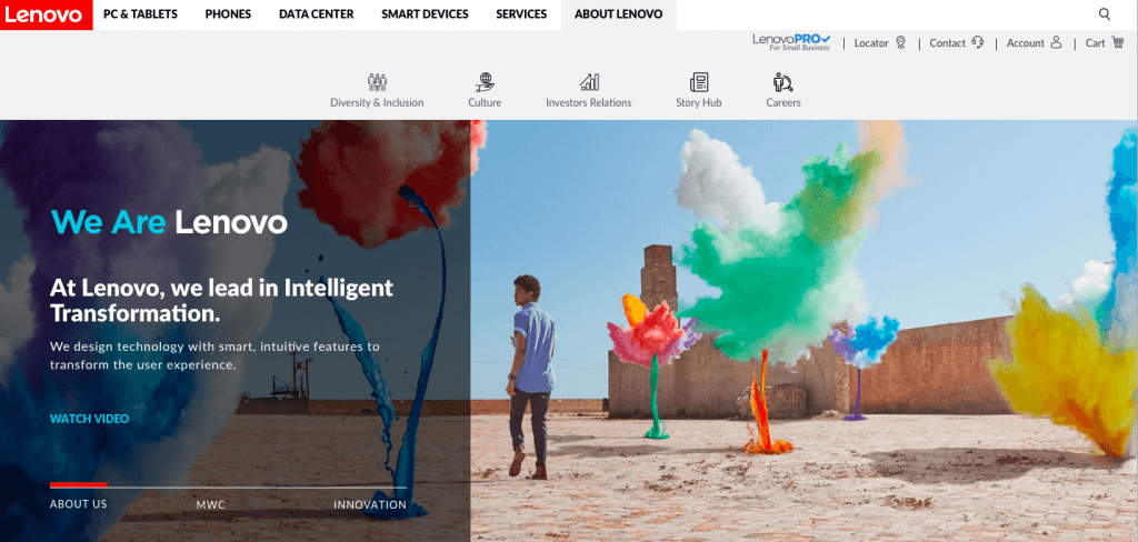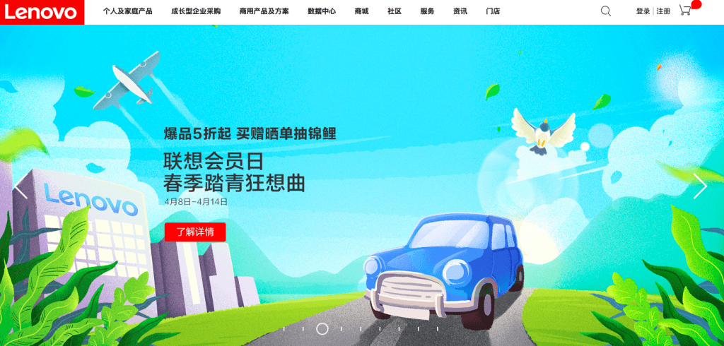 联想的中文网站上有一些中国观众可以联想到的、在中国很常见的图片,比如可爱的卡通图画。对于春节假期,中国网站有一个庆祝中国新年的形象,而美国网站则专注于联想的品牌故事。美国网站也有更多来自美国和欧洲的人的图片和视频,因为它是与美国和欧洲读者相关的内容。联想在全球市场都采用了这种方法。